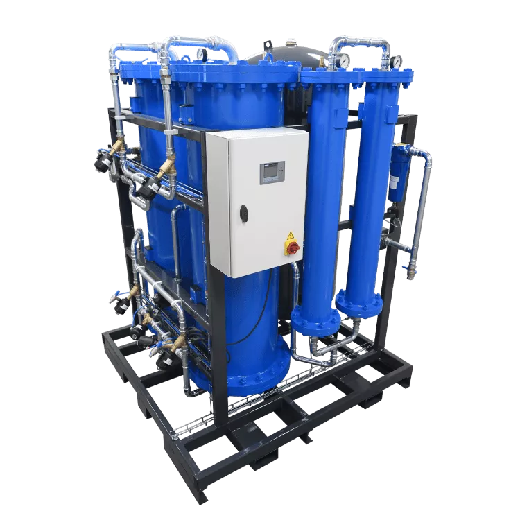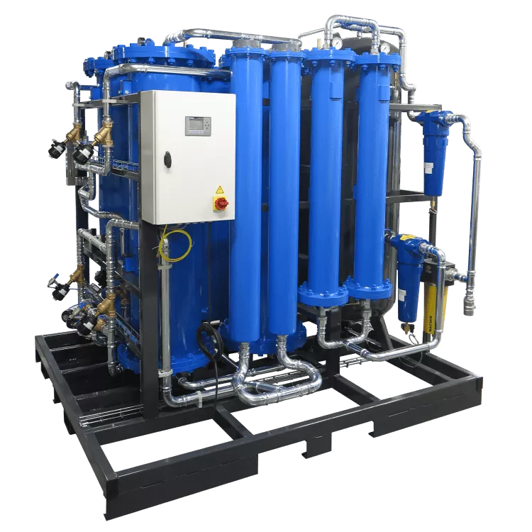 PSA stands for Pressure Swing Absorption and is ideal for projects that require a great deal of nitrogen which must be supplied at high pressure. This involves cool houses with many (>20) cool cells or cool houses in which oxygen removal takes place in multiple cells simultaneously. This concerns volumes greater than 85 m3 h-1. A PSA is suitable for making very pure nitrogen. We supply PSAs with a residual oxygen value of <0.1% and volumes up to 1,200 m3 h-1.