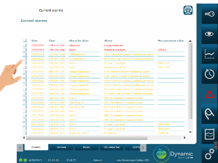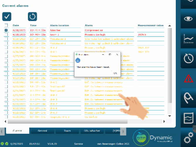 Check the operation of the compressed air compressor and make sure that the output pressure is at least 6 bar. Compressed air may be leaking at the valve set of the CO₂ scrubber. This is because the valves are not fully closed due to pressure deficiency. Solve this by briefly turning the main switch off and on again. Then reset the alarm via the machine(s) display. Finally, reset the alarm in the My Fruit system.